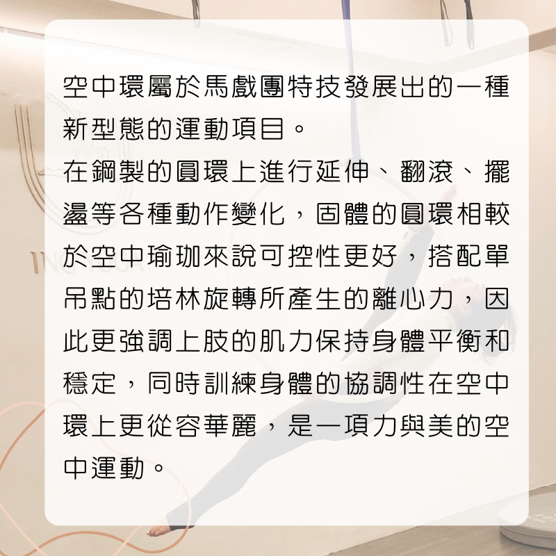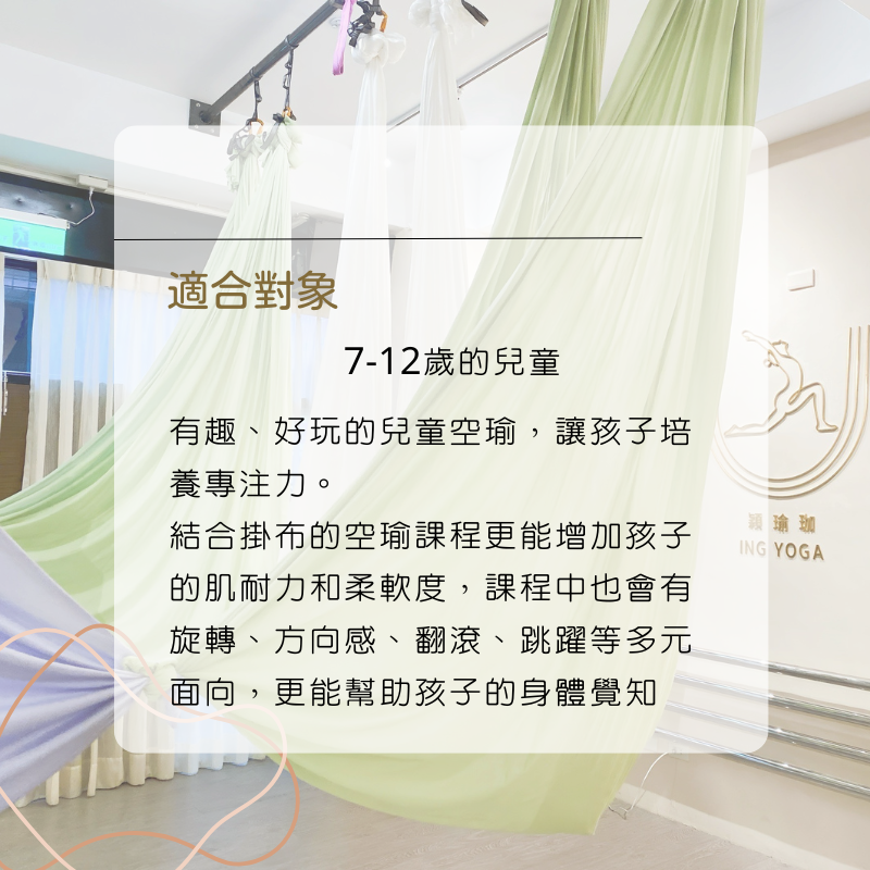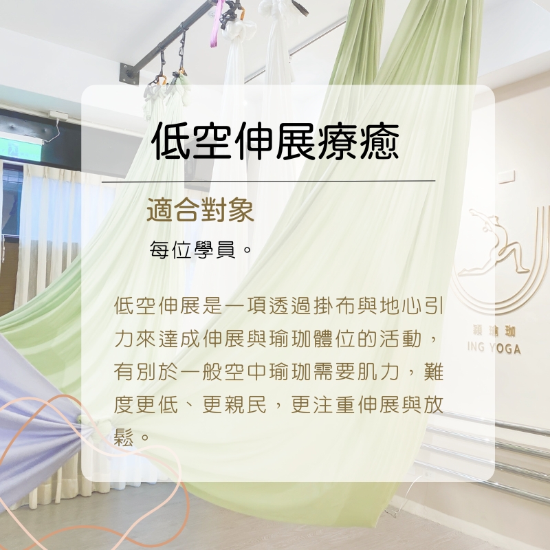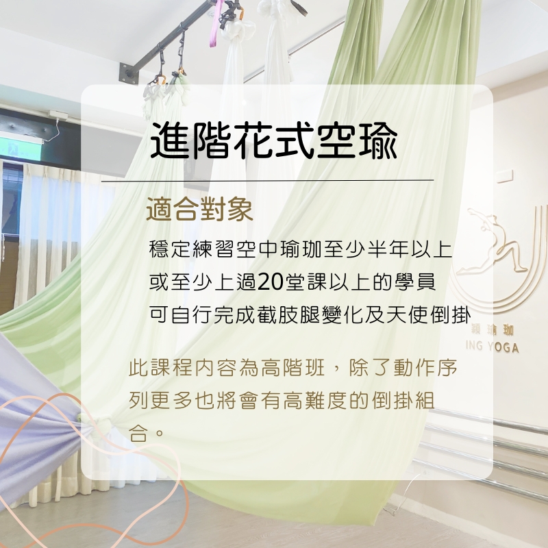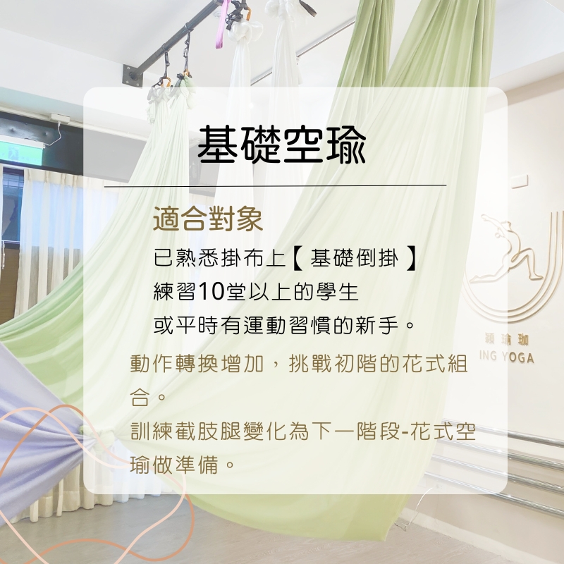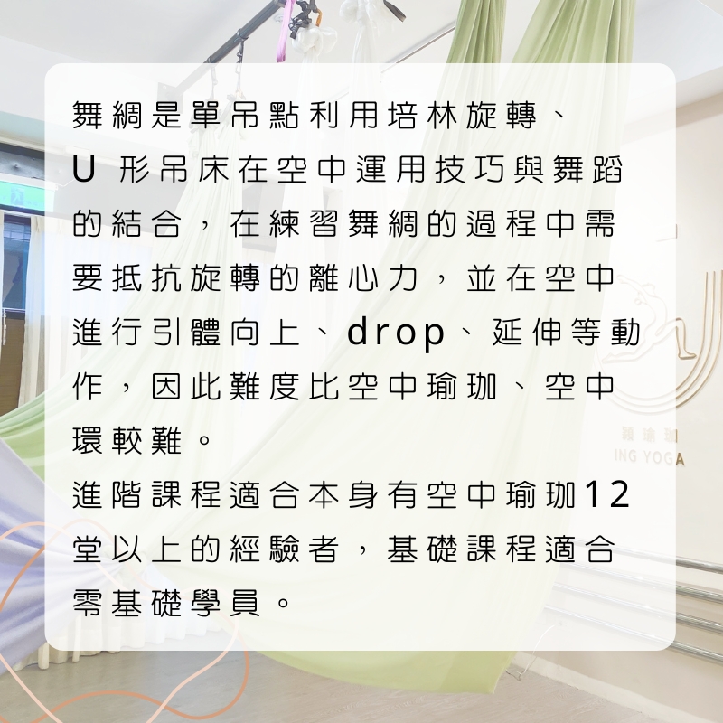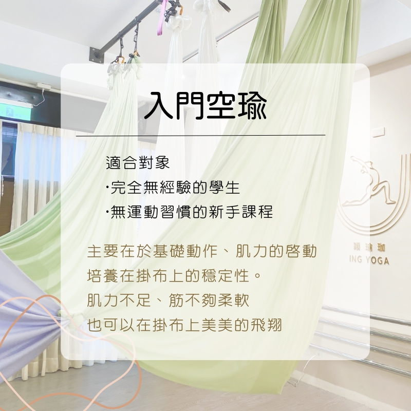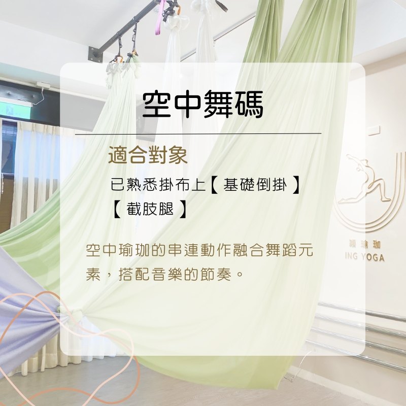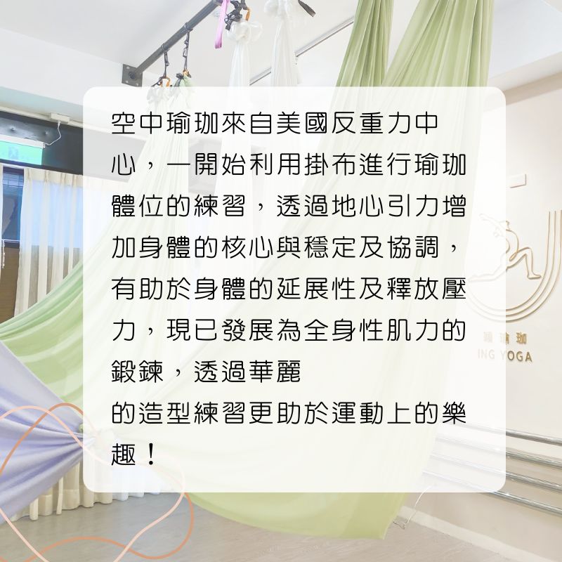 穎瑜珈提供各種多元空中飛行課程,藉由絲綢掛布、空環等高空輔具,在空中進行花式懸吊動作。課程皆有分階難度,新手入門也不怕。